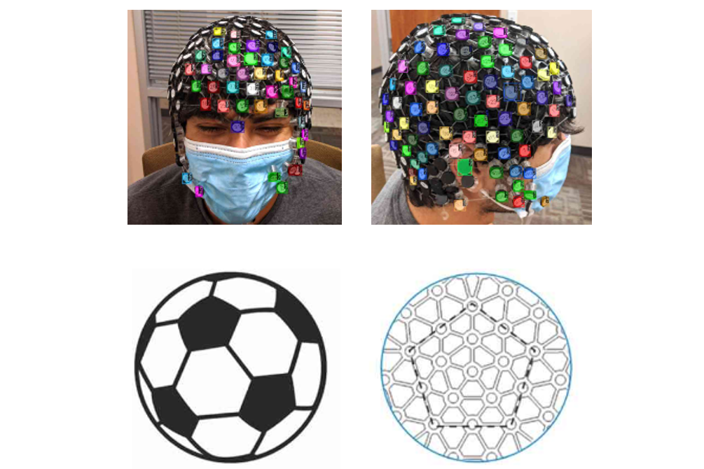 右:基于截尾二十面体的模块化五边形元素(MPE)设计的详细信息。这种几何设计可以更好地逼近球体,因此可以更好地适合头部形状。
