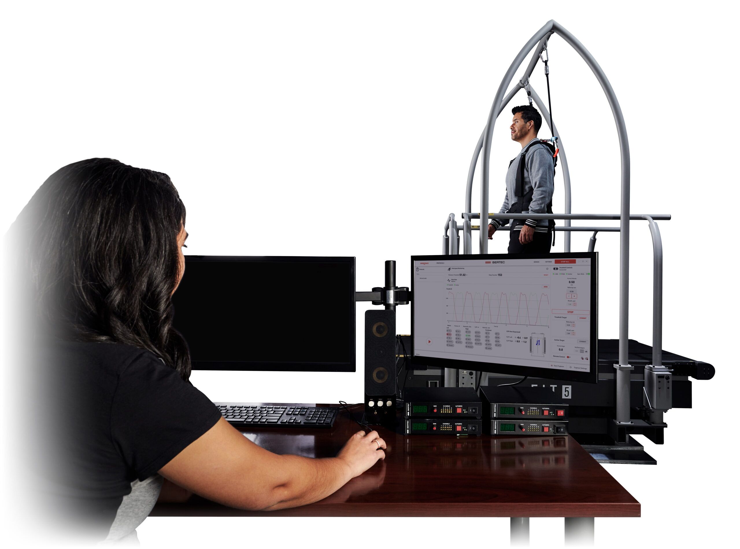 Bertec 分析跑台通过对速度和加速度的控制提供高精度数据,该系统的高固有频率、低振动驱动系统和 Bertec 的定制电子设备能够对每条跑带进行独立且准确的负载测量。