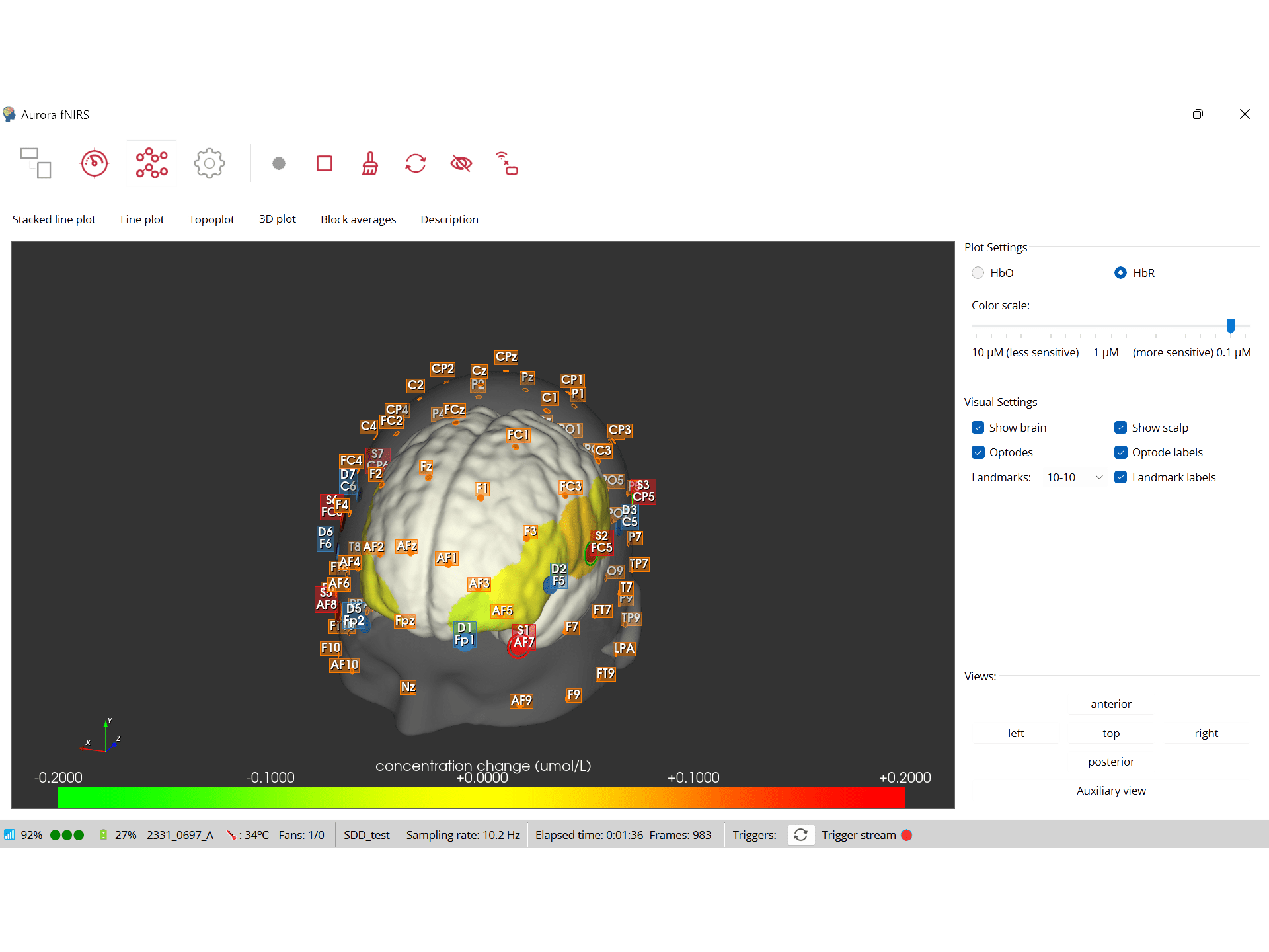 Aurora fNIRS 只需点击几下,即可设置完整的实验配置。自动信号优化算法确保在测量开始前获得最佳信号质量。开始记录数据后,可以实时在多种显示模式下可视化 HbO 和 Hb 的浓度变化。此外,立即可用高端的全头可视化功能。