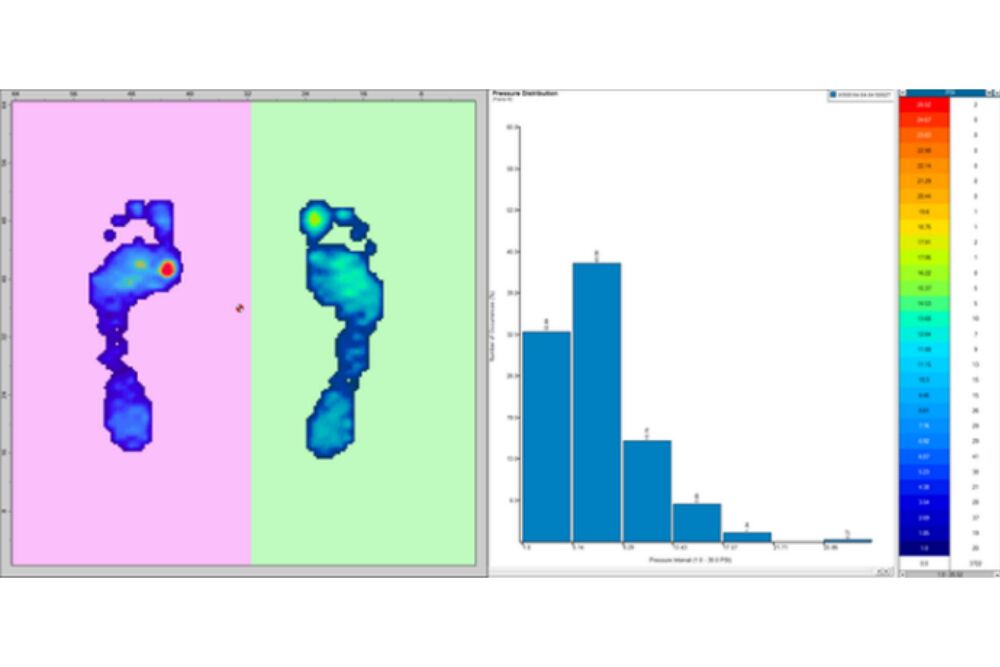 ○ 它显示2D和3D压力图像,并提供完整的足部压力统计和平衡测量
