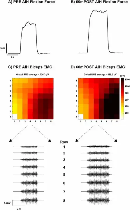 图2:上臂屈曲力量在AIH治疗前后(A和B)的变化,以及相应的肱二头肌HD-EMG信号(C和D),以及对应的原始肌电图信号(下方)。