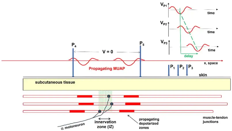 在肌肉激活过程中,运动神经元的放电会导致神经肌肉接头处的去极化。 由此产生的动作电位沿着肌肉纤维向两个方向传播。 这些动作电位的传播细节可以通过肌肉纤维特性来描述。 如果电极与肌肉纤维平行放置,这些特性可以通过HD-EMG非侵入性地测量。 肌肉纤维特性与神经肌肉激活模式无关,因为它们依赖于肌肉的解剖结构和膜特性。 膜特性可能会因离子浓度的变化而改变。