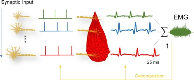 图5:运动神经元放电(左侧),导致产生运动单元动作电位(MUAPs,右侧)。肌电图(EMG)信号是这些MUAPs的总和。通过分解算法,可以从高密度肌电图(HD-EMG)信号中提取出MUAPs和放电时间(黄色箭头所示)。